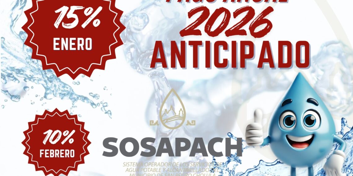 El Sistema Operador de los Servicios de Agua Potable y Alcantarillado del Municipio de San Pedro Cholula (SOSAPACH) informa a las personas usuarias sobre los beneficios vigentes por realizar el Pago Anual Anticipado 2026, conforme al esquema de recaudación anual del organismo.