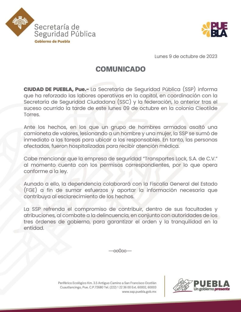 CIUDAD DE PUEBLA, Pue.- La Secretaría de Seguridad Pública (SSP) informa que ha reforzado las labores operativas en la capital, en coordinación con la Secretaría de Seguridad Ciudadana (SSC) y la federación, lo anterior tras el suceso ocurrido este lunes 09 de octubre en la colonia Cleotilde Torres.