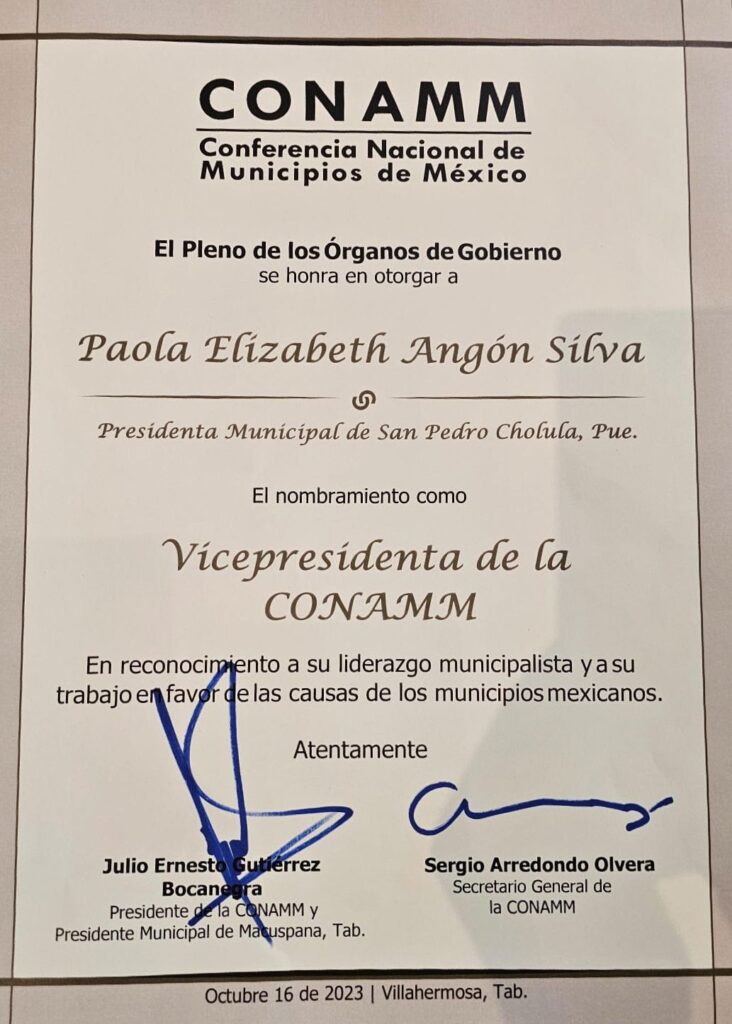 La alcaldesa cholulteca tomó protesta acompañada del Gobernador del estado de Tabasco, Carlos Manuel Merino Campos, en la ciudad de Villahermosa.San Pedro Cholula, Puebla.- Este lunes 16 de octubre, la Presidenta Municipal Paola Angon tomó protesta en la ciudad de Villahermosa, Tabasco, como vicepresidenta de la Conferencia Nacional de Municipios de México (CONAMM), evento en el que estuvieron presentes alcaldes de todo el país.