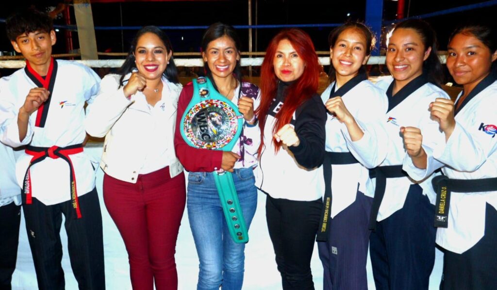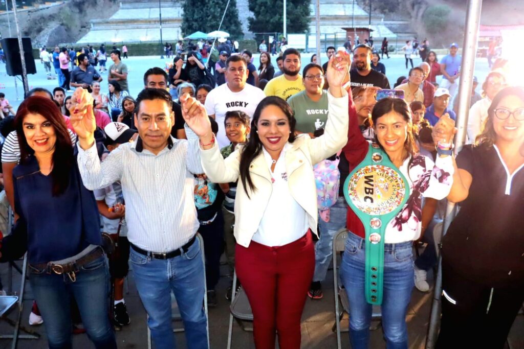 San Pedro Cholula, Pue.- La candidata de la coalición «Sigamos Haciendo Historia» a la presidencia municipal de San Pedro Cholula, Tonantzin Fernández, y la dos veces campeona mundial de Box, Gaby «La Bonita» Sanchez, acudieron como invitadas especiales a una exhibición de Box amateur en el municipio.