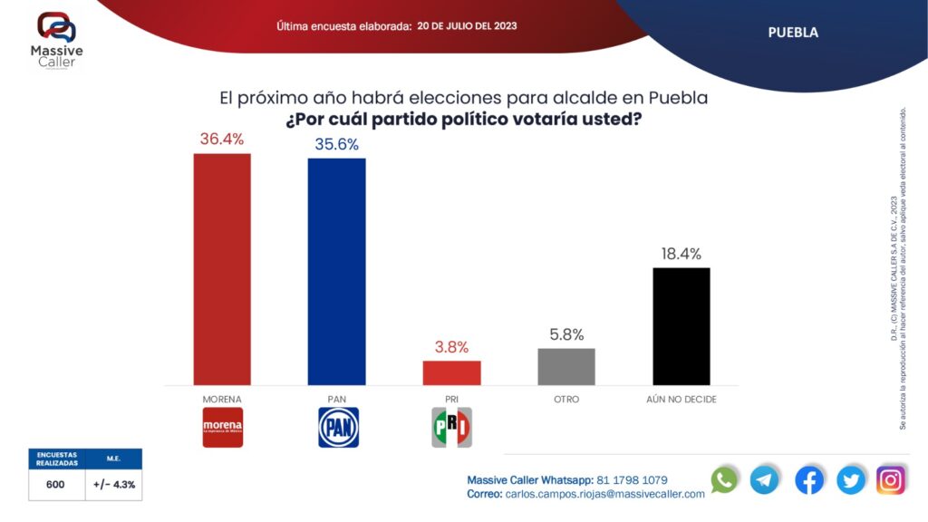 Aunado a esto, Morena también es el partido mejor posicionado para llegar a gobernar la capital, esto, bajo la pregunta: «El próximo año habrá elecciones para alcalde de Puebla ¿Por cuál partido votaría usted?», siendo que el 36.4% afirmó votar por Morena.