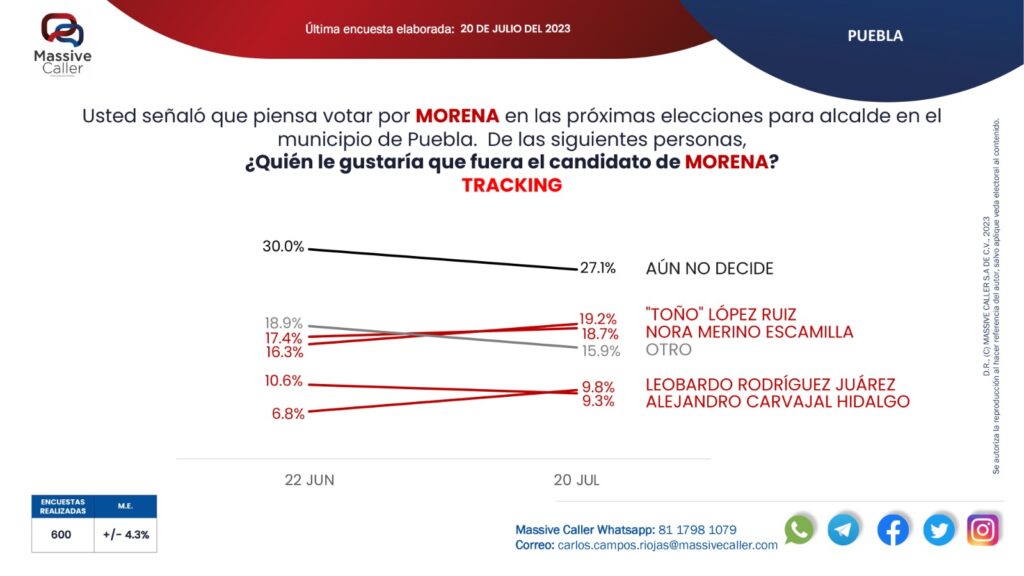 Cabe mencionar que, la de Massive Caller, no es la única casa encuestadora que presenta a Toño López como el mejor perfil de la alianza Morena-PT-PVEM para ir como candidato por la alcaldía de Puebla, sino también BEAP y Mas Data le han dado ese título, mediante sus estudios realizados en la capital.