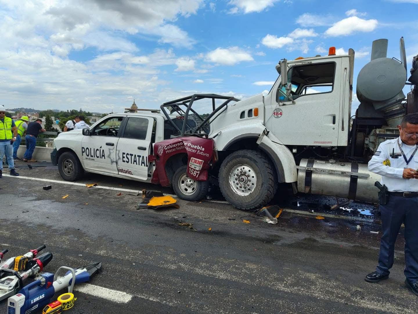 Dos agentes de la Policía Estatal fallecieron en un aparatoso accidente en la autopista México-Puebla. El choque ocurrió cuando los patrulleros detuvieron a un trailer y otro tractocamión los atropelló en el segundo piso.