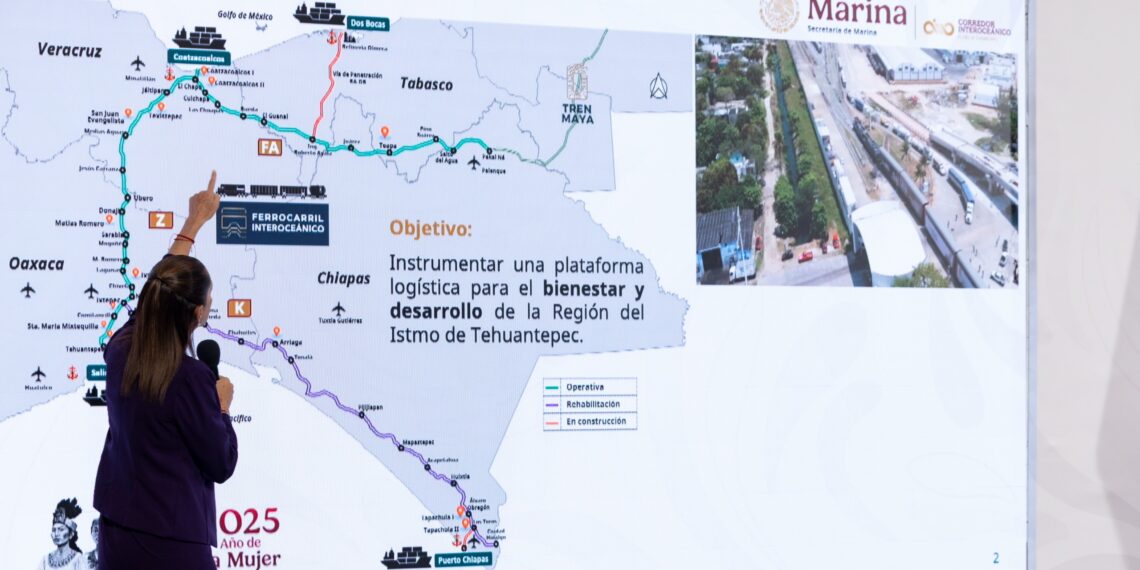 La Presidenta de México, Claudia Sheinbaum Pardo, resaltó que en noviembre se inaugura el primer tramo de la Línea K del Tren Interoceánico y se avanza con el Gobierno de Guatemala para que dicha línea llegue al país centroamericano. Mientras que el tramo Roberto Ayala–Dos Bocas de la Línea FA permitirá llevar parte de la producción de la Refinería Olmeca al sureste del país.